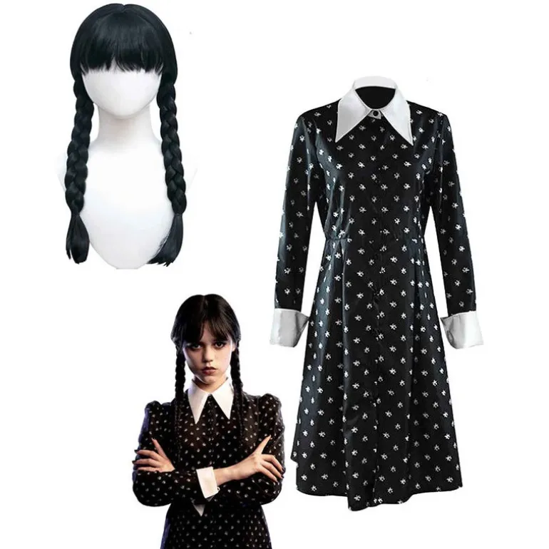 Se trata del mismísimo vestido que lleva Miércoles en las escenas en la que la vemos con su familia, fuera su oscura academia. Es un conjunto de chaqueta y falda 100% poliester y una peluca con trenzas que te transformará en Wednesday en un periquete.