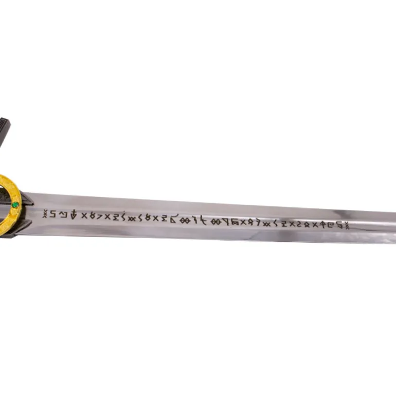 Fíjate en su preciosa empuñadura con el característico broche dorado con incrustaciones de piedras rojas y verdes que tiene en la cruz. Tiene un tamaño total de 123,5 cm, solo la hoja, realizada en acero y con runas grabadas a lo largo, ya son 84,5cm y 5cm de ancho, y viene con su propia funda, lista para una buena sesión de fotos.