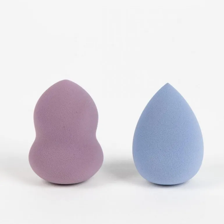 La esponja lila tiene una forma ergonómica con curvas suaves que facilitan el agarre y permiten una aplicación precisa del maquillaje en zonas difíciles. Por otro lado, la esponja azul tiene una forma de gota clásica ideal para una aplicación uniforme en todo el rostro.