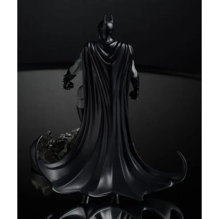 Batman se erige sobre una base detallada que simula un terreno rocoso, realzando su postura heroica y serena. Los acabados en tonos grises y negros subrayan su actitud vigilante. Esta estatua con licencia oficial es perfecta para coleccionistas y admiradores del universo DC, y se presenta como un regalo ideal o un destacado elemento decorativo en cualquier colección.