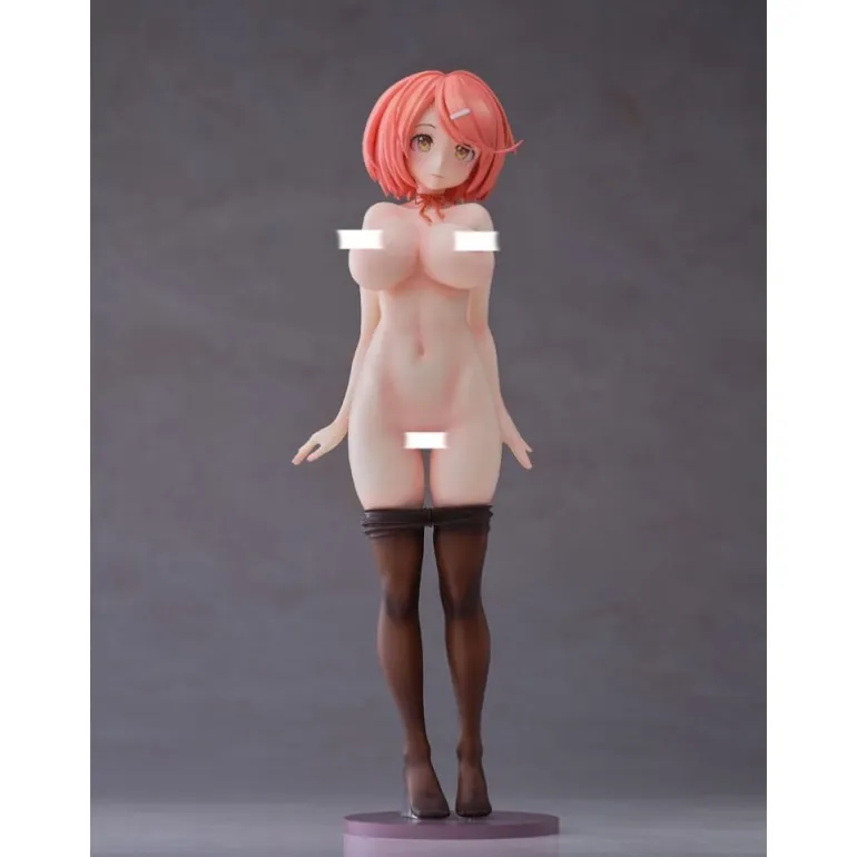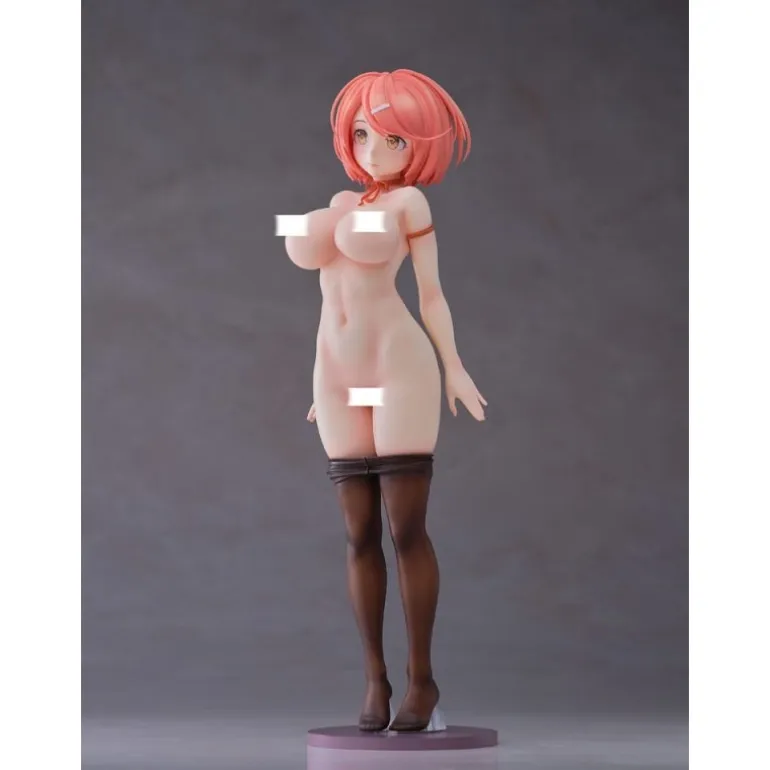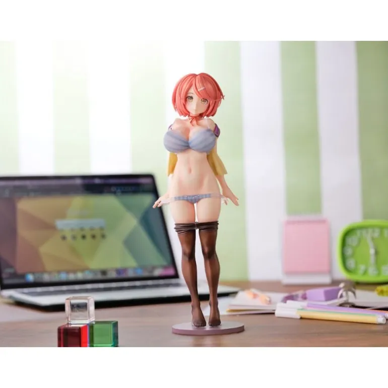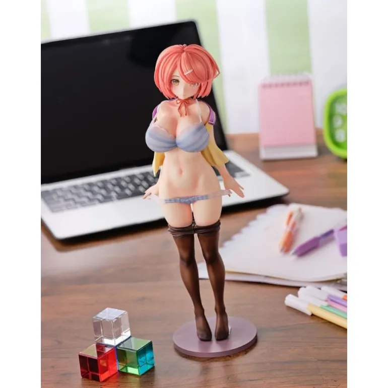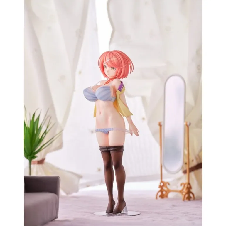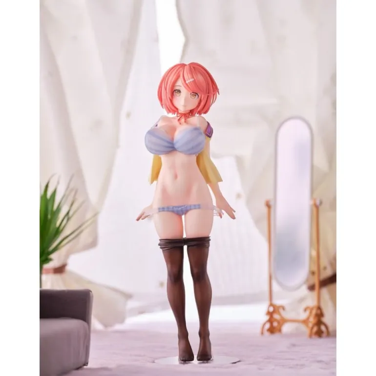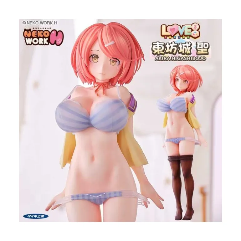 La figura presenta a Akira en una postura encantadora y dinámica, con un cabello rosado vibrante que complementa perfectamente su atuendo de tonos suaves. Lleva un conjunto ligero en azul y blanco, combinado con largas medias negras que añaden un toque sofisticado. Su expresión serena y detallada añade un elemento de realismo a esta obra de arte.