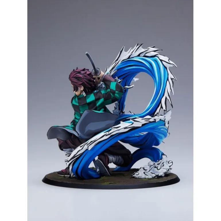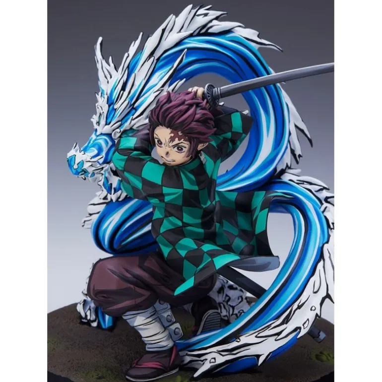 El personaje se muestra en una postura de ataque poderosa, blandiendo su espada con determinación. La escultura también incluye un dragón de agua azul, que añade un efecto visual impresionante y realza la magnificencia de la figura. Viene empaquetada en una elegante caja con ventana, ideal para exhibición o regalo.