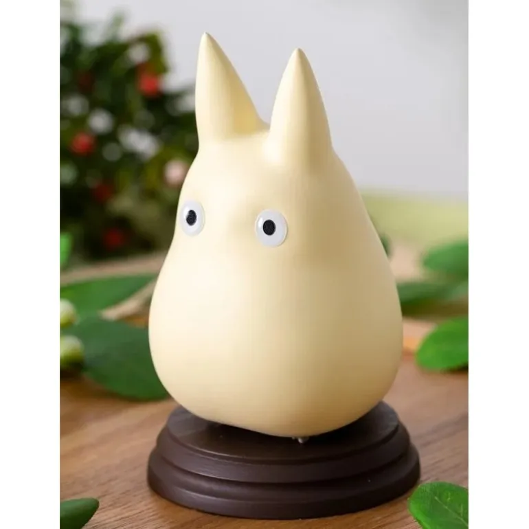 El diseño simple pero icónico muestra a Totoro en un tono blanco suave, con sus características orejas puntiagudas y ojos grandes que reflejan una apariencia de sorpresa. La base marrón proporciona estabilidad y un toque de elegancia.