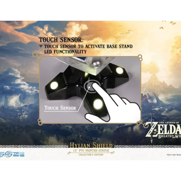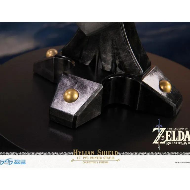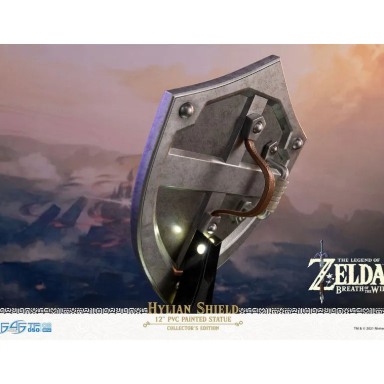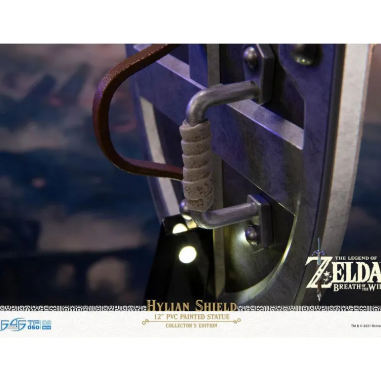Se trata de una réplica oficial diseñada y fabricada por la prestigiosa firma First 4 Figures, completamente fiel al escudo original, tal como aparece en este caso en The Legend of Zelda: Breath of the Wild, que cuenta con unas dimensiones de 29 x 20 x 13 cm, así que aunque no es de tamaño real, tampoco es una pieza pequeña. Está fabricada en PVC y tanto el trabajo de pintura como los acabados son absolutamente excepcionales, con cada uno de los detalles de este escudo muy bien reproducidos. Además, cuenta con una base especial diseñada para la ocasión, a la que el escudo de adhiere magnéticamente, y que cuenta con iluminación LED por lo que su presentación es una auténtica maravilla.