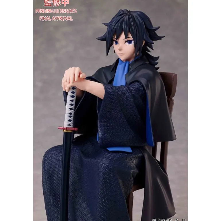 Giyu Tomioka, con su característico atuendo, se presenta sentado con su espada en las manos, mostrando una expresión decidida y serena. Los colores azul oscuro y negro dominan su vestimenta, acentuando su presencia imponente. Su cabello oscuro esculpido con precisión resalta su personalidad distintiva.