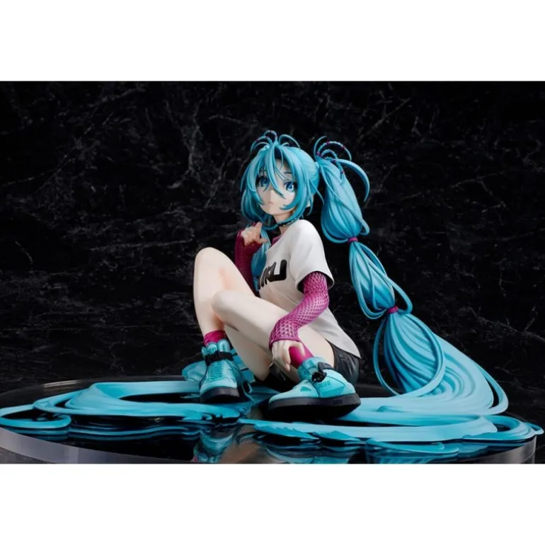 Descubre la estatua de Hatsune Miku en su edición limitada más reciente de The Latest Street Style «Cute». Fabricada en PVC y a escala 1/4, esta detallada figura mide aproximadamente 17 cm. Captura a Hatsune Miku en un encantador estilo urbano, con un atuendo compuesto por una camiseta blanca, mangas de malla rosa, y zapatillas deportivas de color azul que combinan con su icónico cabello.