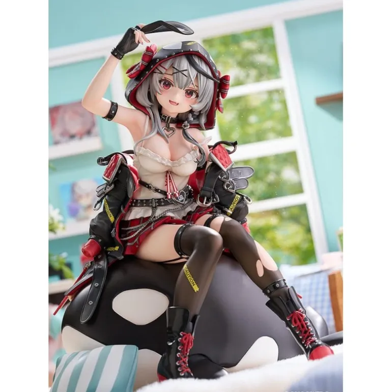 Chloe aparece sentada de manera relajada sobre una base mullida y acariciando un accesorio en la mano, luciendo su icónico atuendo con una chaqueta negra, falda a cuadros y medias de estilo punk. Su expresión amigable y su cabello plateado hacen que esta estatua sea un deleite visual desde cualquier ángulo.