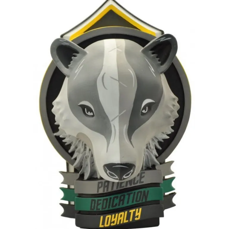 Se trata de una estatua de la firma Plastoy, de 26 cm, diseñada para colocar en la pared, fabricada en poliresina y con una enorme calidad de acabados y un trabajo de pintura excepcional. Una escultura o busto basado en el animal representativo de Hufflepuff, el tejón y que además incluye las tres palabras que mejor definen el espíritu y valores de Hufflepuff: Paciencia, Dedicación, Lealtad.