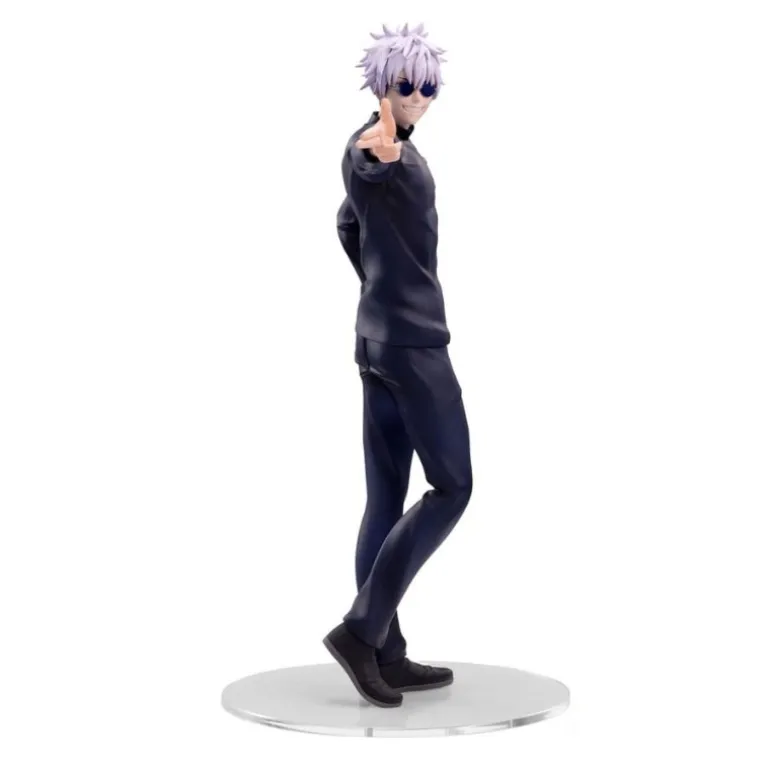 La estatua captura a Satoru Gojo con su icónico cabello blanco y gafas oscuras, vestido con su característico traje oscuro. Su pose dinámica, con el brazo extendido y un gesto confiado, aporta una dosis de acción y estilo, perfecta para cualquier exhibición.