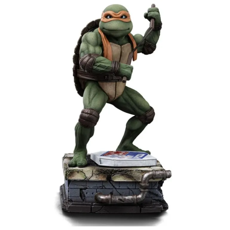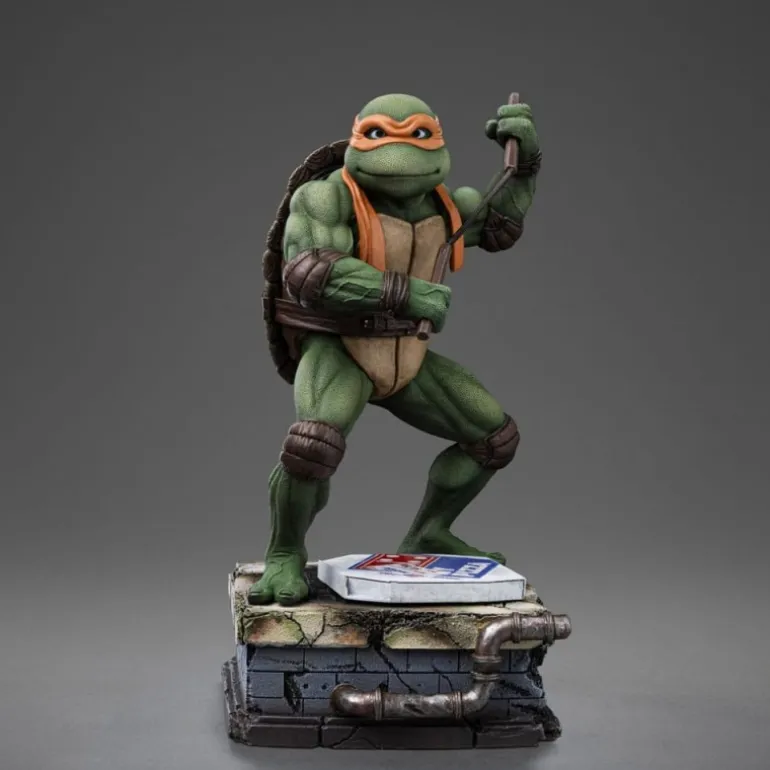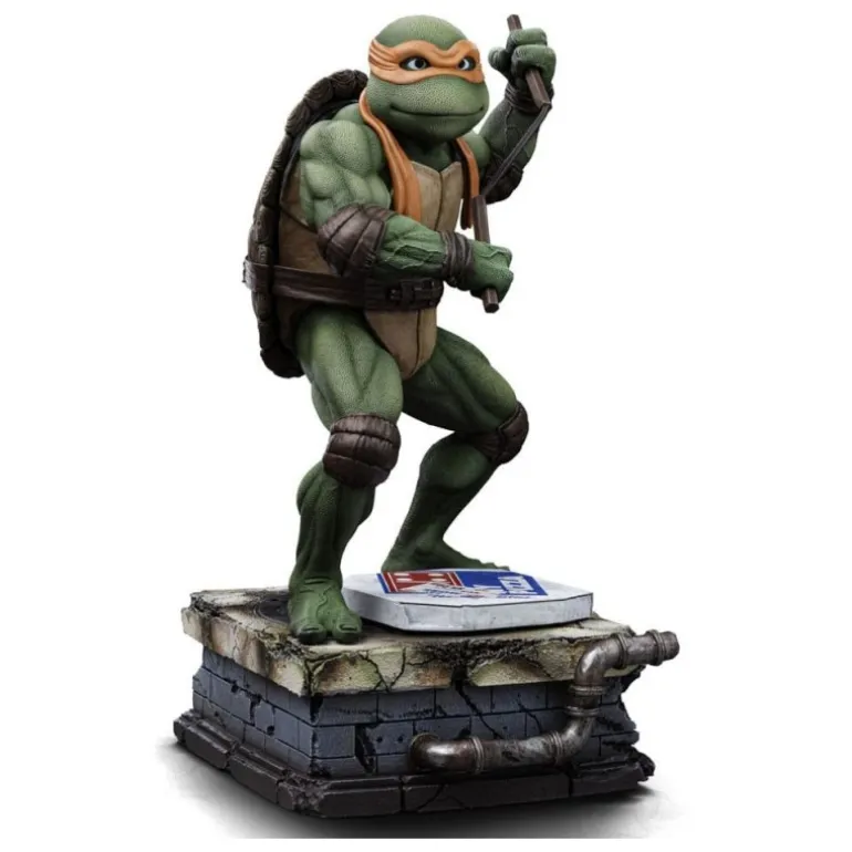 La estatua destaca por los colores vibrantes y la textura detallada de su piel y caparazón que reflejan su carácter jovial y aventurero. Es un artículo con licencia oficial, producido por Iron Studios, conocido por su atención al detalle y fidelidad en las representaciones de personajes emblemáticos. Perfecto para coleccionistas de la serie Teenage Mutant Ninja Turtles y fanáticos de los superhéroes.