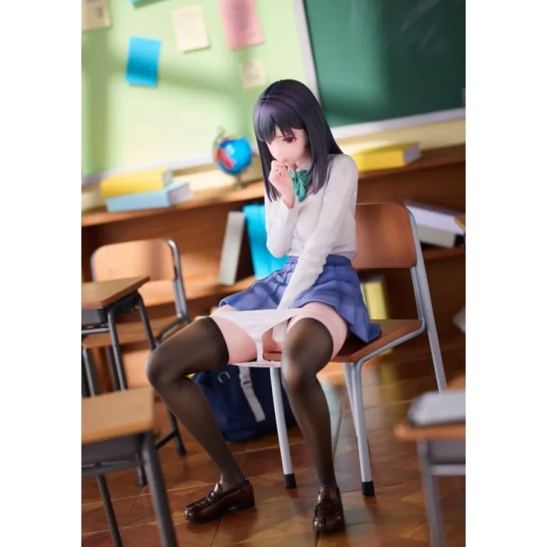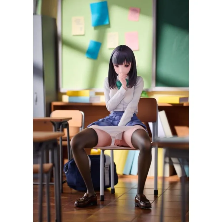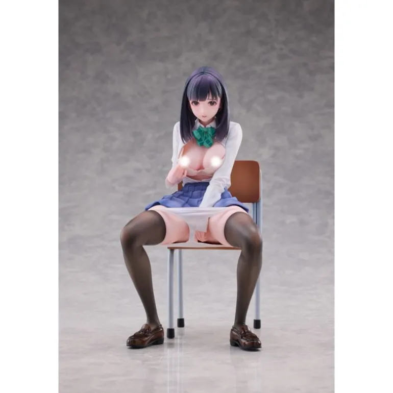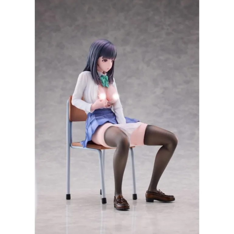 El personaje Shigure se presenta sentado en una silla, con expresión y postura que reflejan una situación sorprendente y cautivadora. Su vestimenta está meticulosamente esculpida para resaltar los pliegues de su falda y la textura de su camisa y corbata. El color de su cabello y traje se presenta en tonos realistas y atractivos, proporcionando un acabado auténtico.