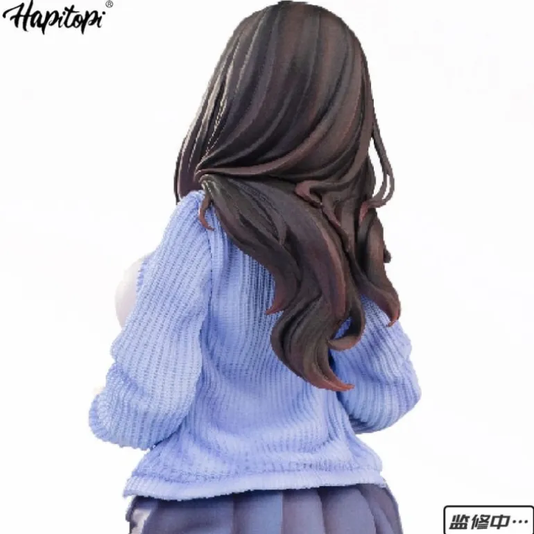 La estatua muestra a una joven de cabello largo y oscuro, vestida con un conjunto casual que incluye un jersey azul y una falda corta. La base azul realza su postura dinámica y estilizada, capturando una expresión serena en su rostro. La figura viene empaquetada en una práctica caja con ventana, ideal para exhibir sin abrir el embalaje.