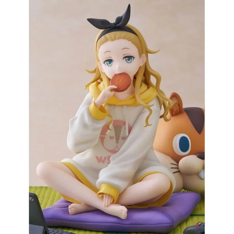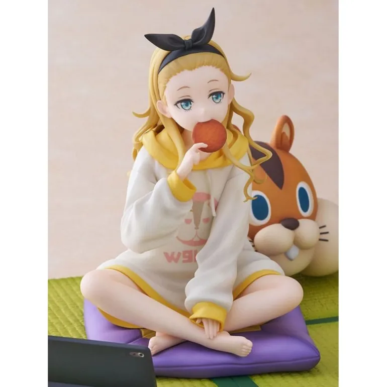 Descubre la estatua de PVC 1/7 de Kurumi inspirada en el anime ‘Lycoris Recoil’. Esta detallada figura de 13 cm muestra a Kurumi en una pose relajada, sentada con las piernas cruzadas y sosteniendo una galleta. Lleva una sudadera blanca con detalles en amarillo, que complementa su expresión serena. A su lado, un adorable cojín con forma de animal agrega un toque de encanto a la escena. La estatua descansa sobre una base verde que simula un tatami, creando un ambiente acogedor.