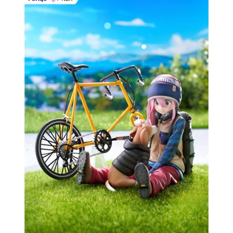 La figura está meticulosamente detallada, desde su gorro azul y su cabello rosa hasta su vestimenta de colores vibrantes que incluyen un chaleco beige sobre una camisa de cuadros azul. Nadeshiko está representada en una postura natural y relajada, lo que resalta su amor por el camping y la naturaleza. La bicicleta, con su estructura precisa y detalles como el manillar y las ruedas negras, añade un toque de realismo a la escena campestre.