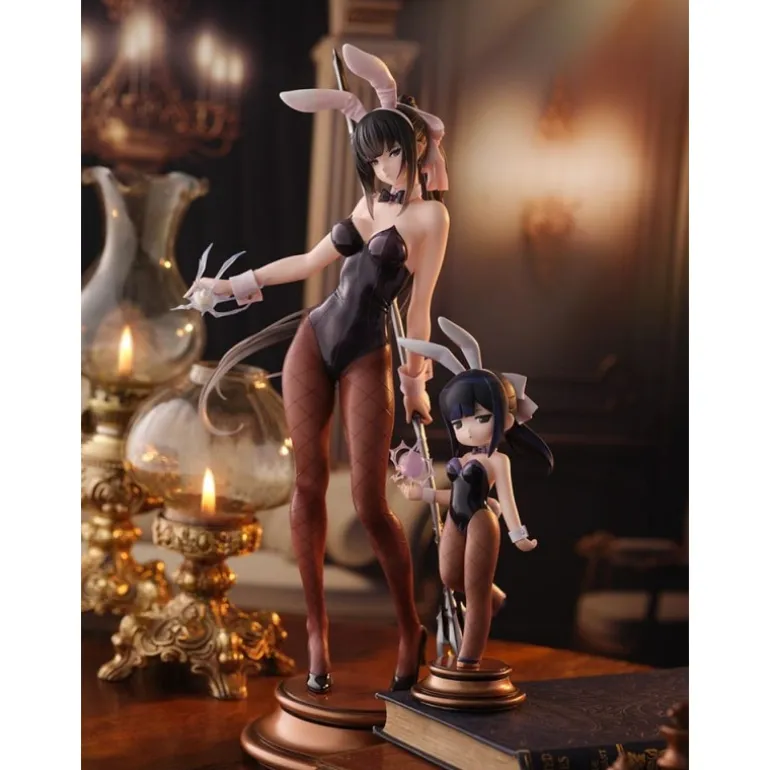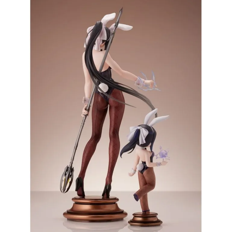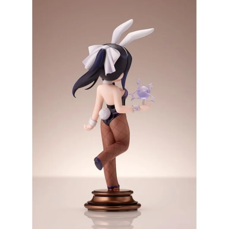 La figura muestra a Narberal Gamma con un atuendo de coneja, incluyendo un elegante traje negro con acabados en tonos morados, medias de red detalladas y orejas de conejo. Destaca asimismo su expresión serena y su postura segura, que la convierten en una pieza única para los fans y coleccionistas del manga y anime.