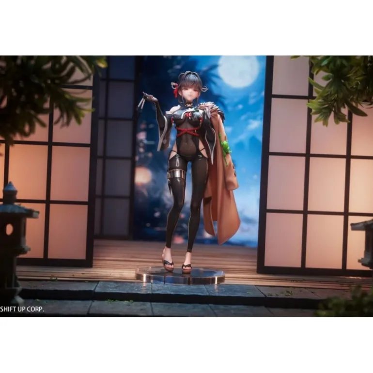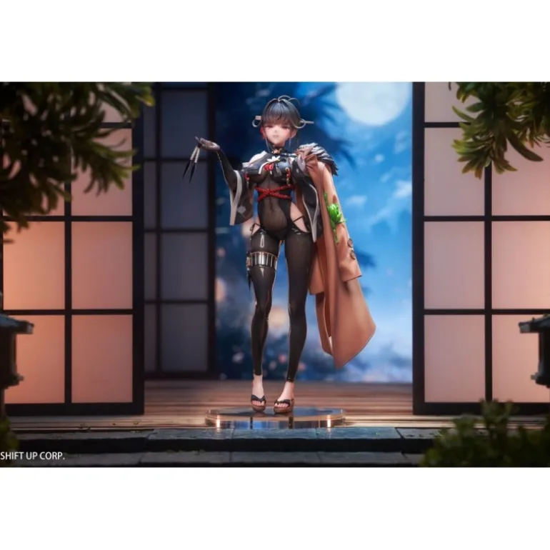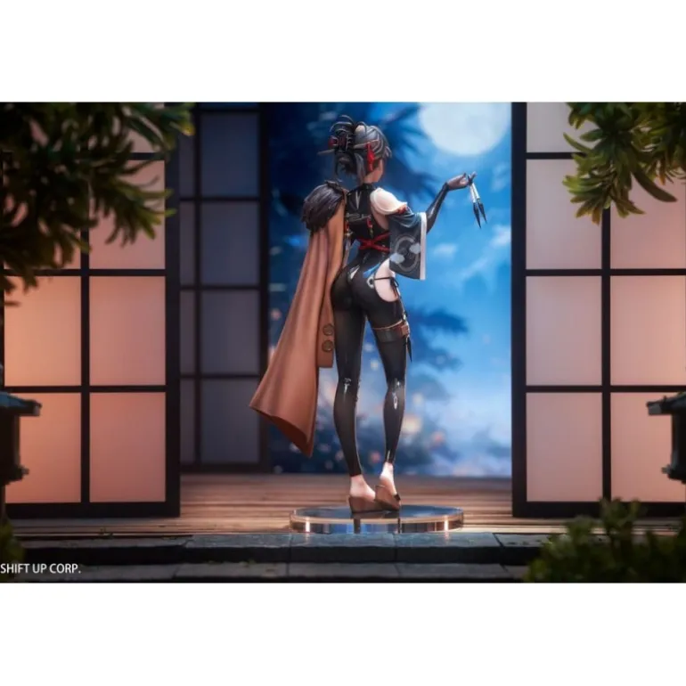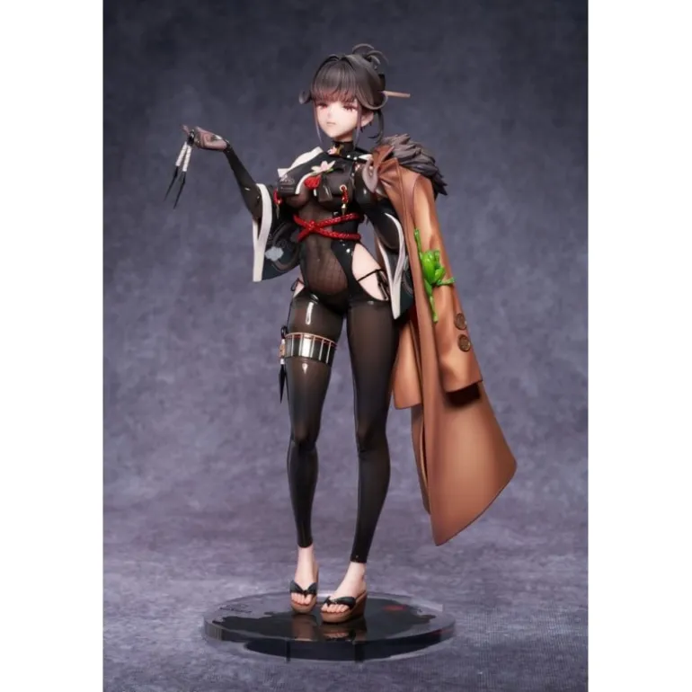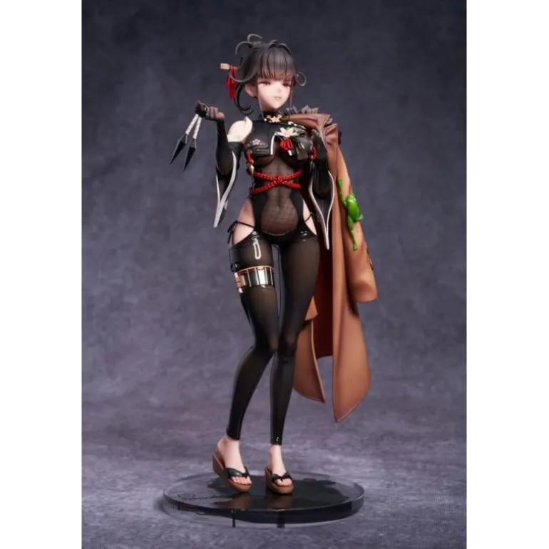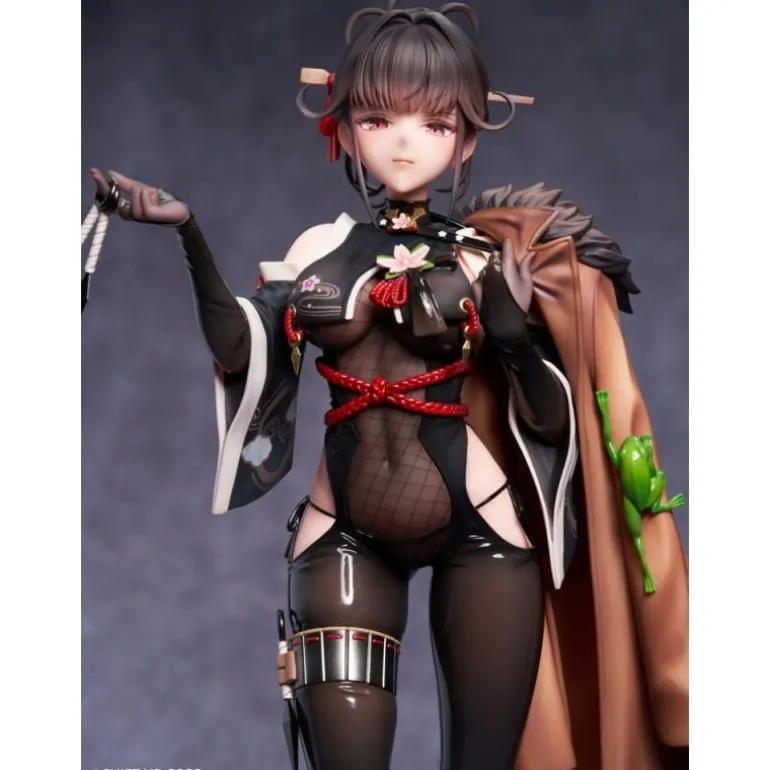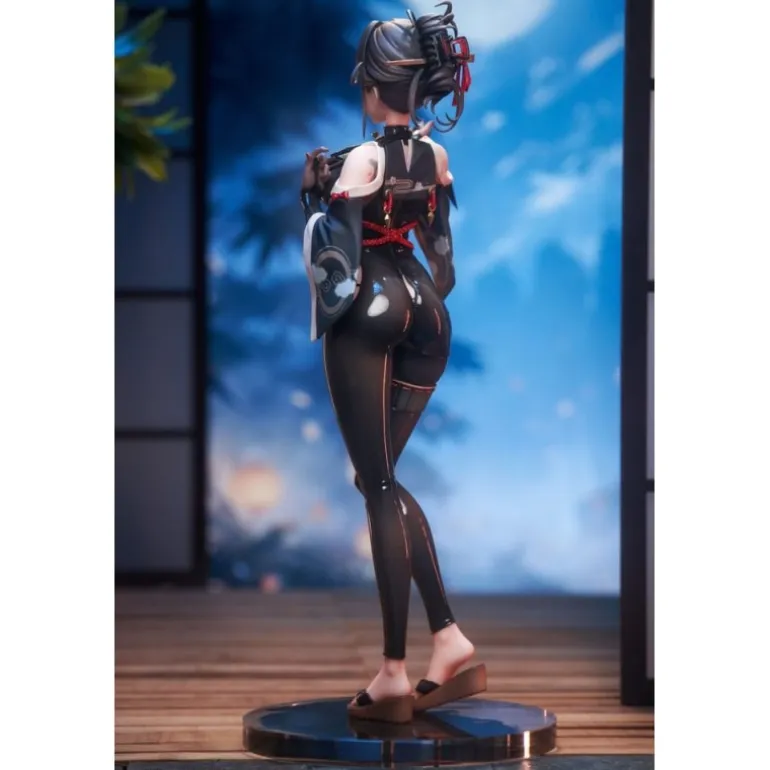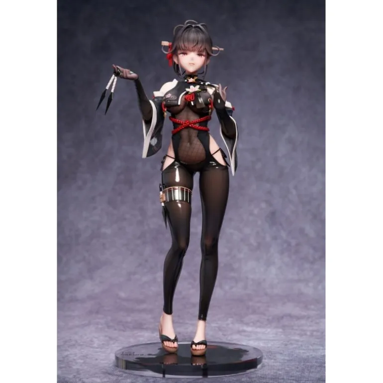Vestida en un elegante traje negro, con transparencias estratégicas y detalles rojos, Sakura se presenta en una postura dinámica y poderosa. La base transparente con diseños de nubes añade un toque distintivo, elevando el impacto visual de la figura.
