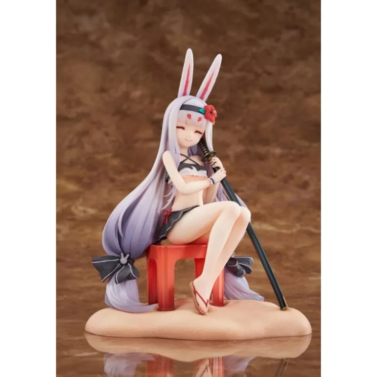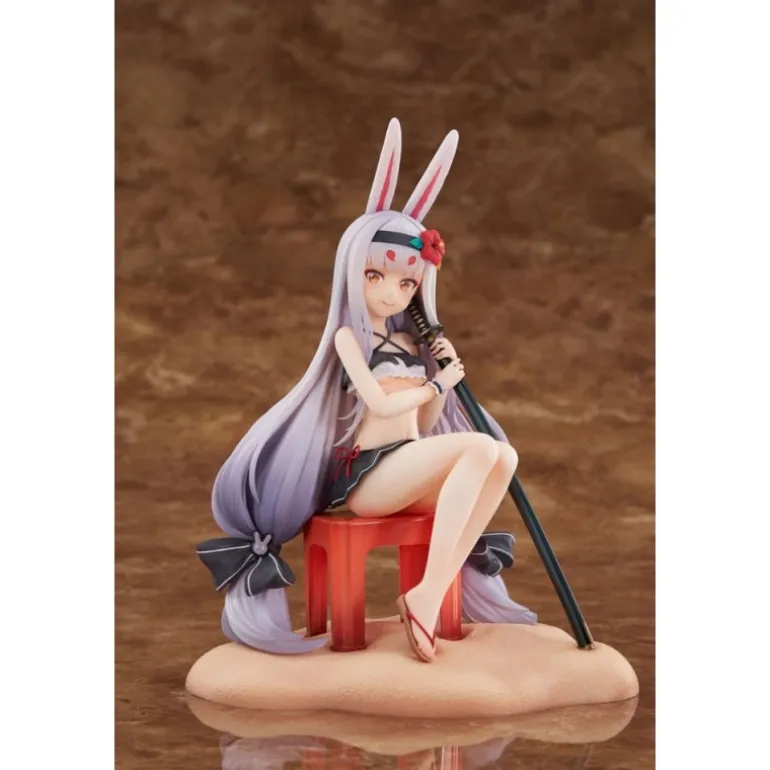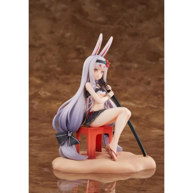 Fabricada en PVC de alta calidad por Elegant, esta figura destaca por su increíble nivel de detalle. Shimakaze luce un traje veraniego con orejas de conejo, un accesorio floral rojo en el cabello y sandalias rojas, todo sobre una base que simula arena. El acabado detallado de su cabello largo y lila le otorga un realismo impresionante.