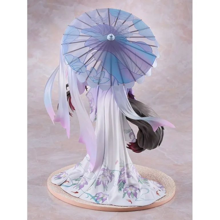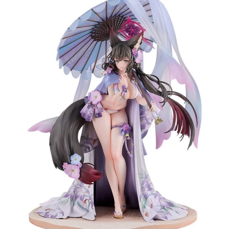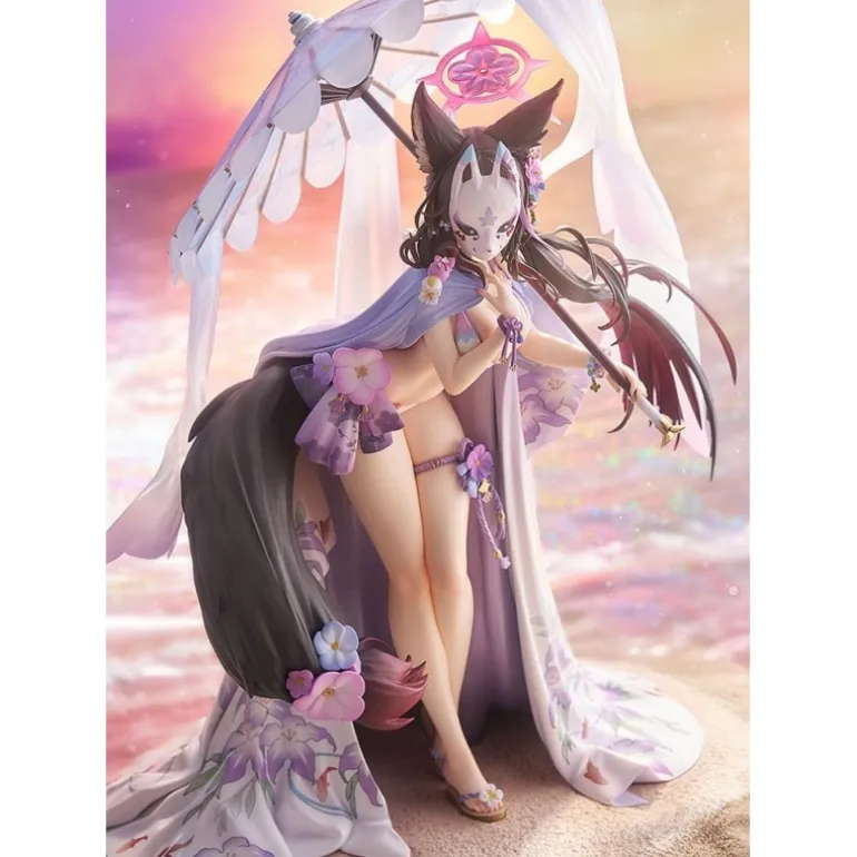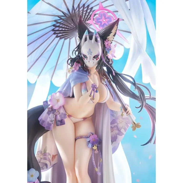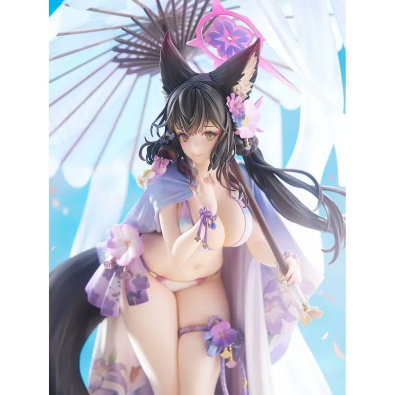 Wakamo se presenta con un elegante traje de baño decorado con flores y un parasol, lo que le da un toque veraniego y sofisticado. Su expresión serena y los adornos florales realzan su encanto, mientras que su postura y la fluidez de su cabello añaden dinamismo a la figura.