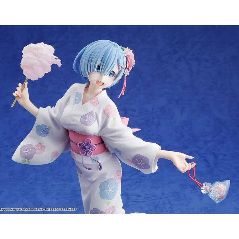 Descubre la belleza de Rem en esta detallada estatua de PVC de 23 cm, inspirada en el popular anime «Re:ZERO -Starting Life in Another World-«. Esta figura presenta a Rem con un elegante yukata adornado con flores de colores pastel, resaltando su encantadora personalidad. Sostiene un dulce de algodón rosa en una mano y un pequeño pez dorado en bolsa en la otra, evocando la atmósfera de un alegre festival japonés.