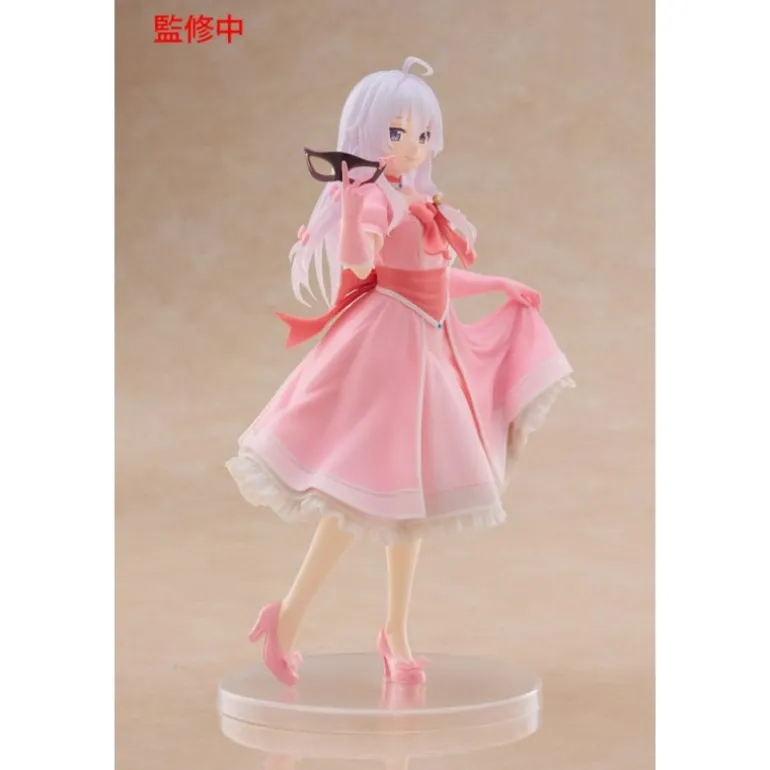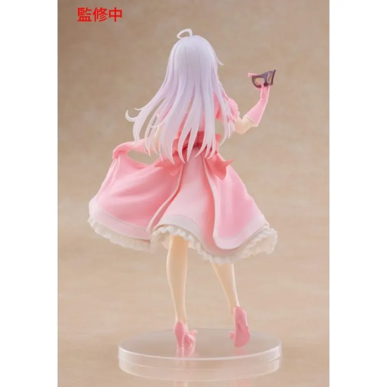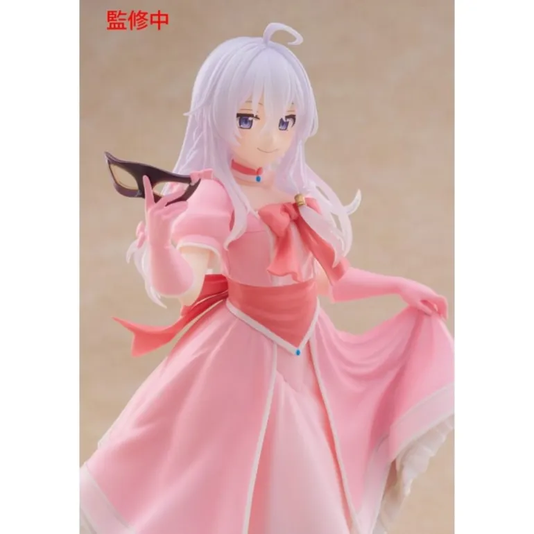 La estatua presenta a Elaina con un vestido de fiesta rosa, decorado con delicados lazos y un detalle de máscara en su mano, que realzan su encanto y sofisticación. Su pelo blanco y su expresión serena capturan perfectamente su personalidad.