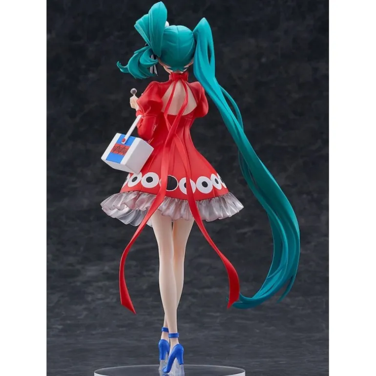 Descubre la estatua de PVC de Hatsune Miku en su versión Psi Ver., una joya coleccionable de la serie Character Vocal Series 01. Con una altura aproximada de 23 cm, esta figura muestra a Miku con su icónico cabello azul verdoso recogido en coletas altas. Lleva un vestido rojo vibrante adornado con patrones circulares en blanco y negro y detalles en volantes translúcidos en la parte inferior. Sus zapatos de tacón azul intenso completan un look moderno y llamativo. Además, sostiene una caja de dulces que añade un toque encantador al diseño. Fabricada por Good Smile Company, esta estatua de colección viene en una práctica caja con ventana, perfecta para exhibirla sin sacarla de su embalaje. Es un producto con licencia oficial, asegurando su calidad y originalidad, ideal tanto para un regalo creativo como para enriquecer tu colección personal.