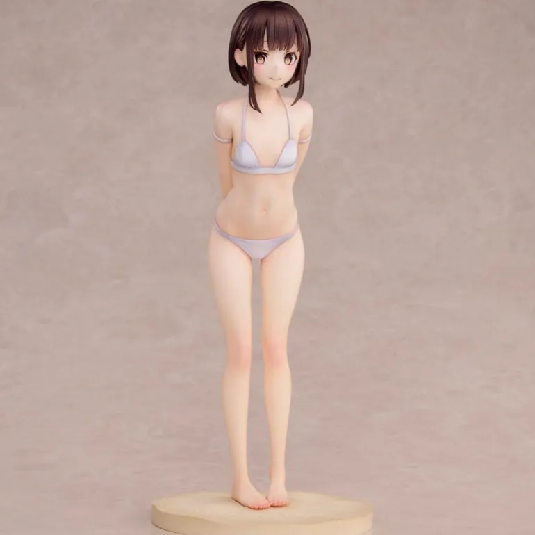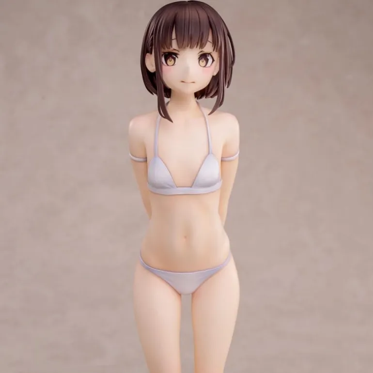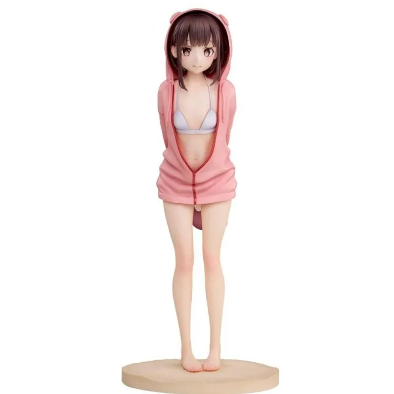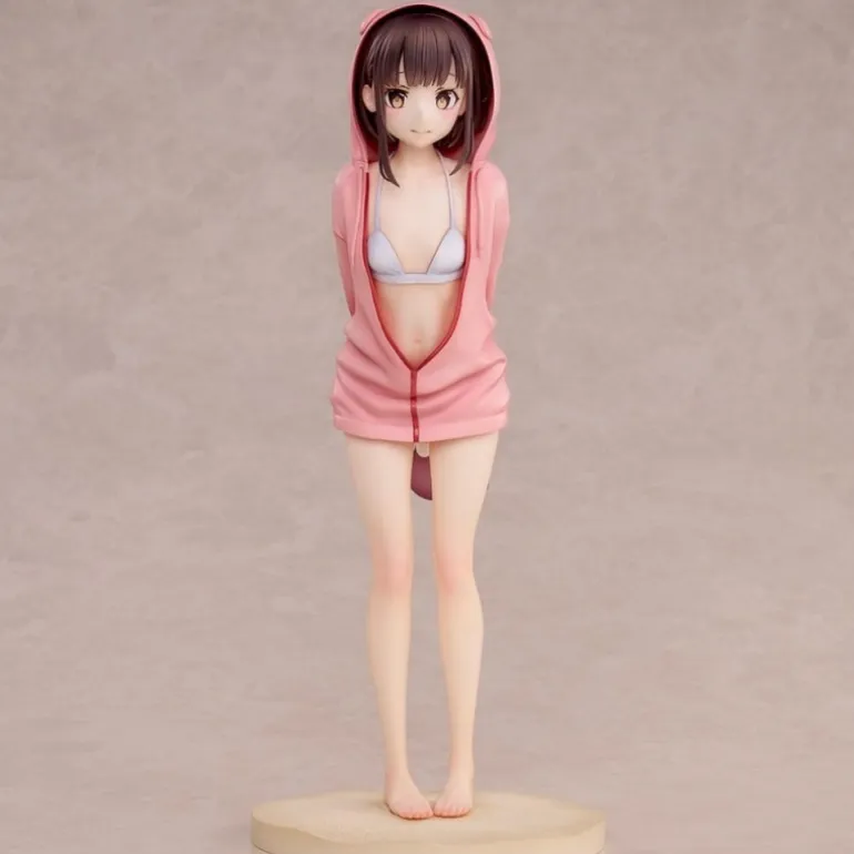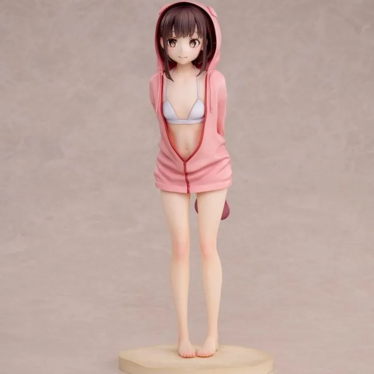 La figura representa a Misaki con un atuendo de bikini, cubierto parcialmente por una sudadera con capucha rosada. La pose y los detalles meticulosos hacen de esta estatua un complemento perfecto para cualquier colección de anime y manga.