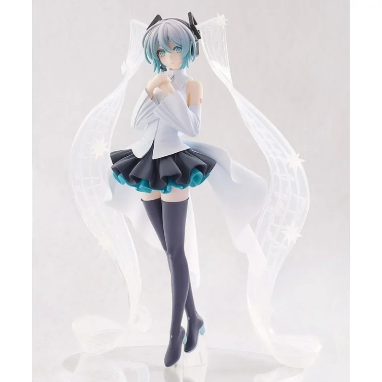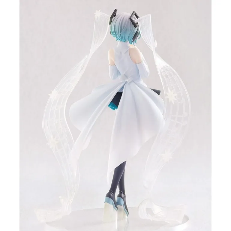 Con una altura aproximada de 18 cm, la estatua presenta a Hatsune Miku vistiendo un encantador conjunto blanco y negro. Su falda tiene un acabado ondulado con tonos azul turquesa que añaden un toque de color vibrante. Los detalles son exquisitos, desde su cabello azul claro hasta sus características medias largas.