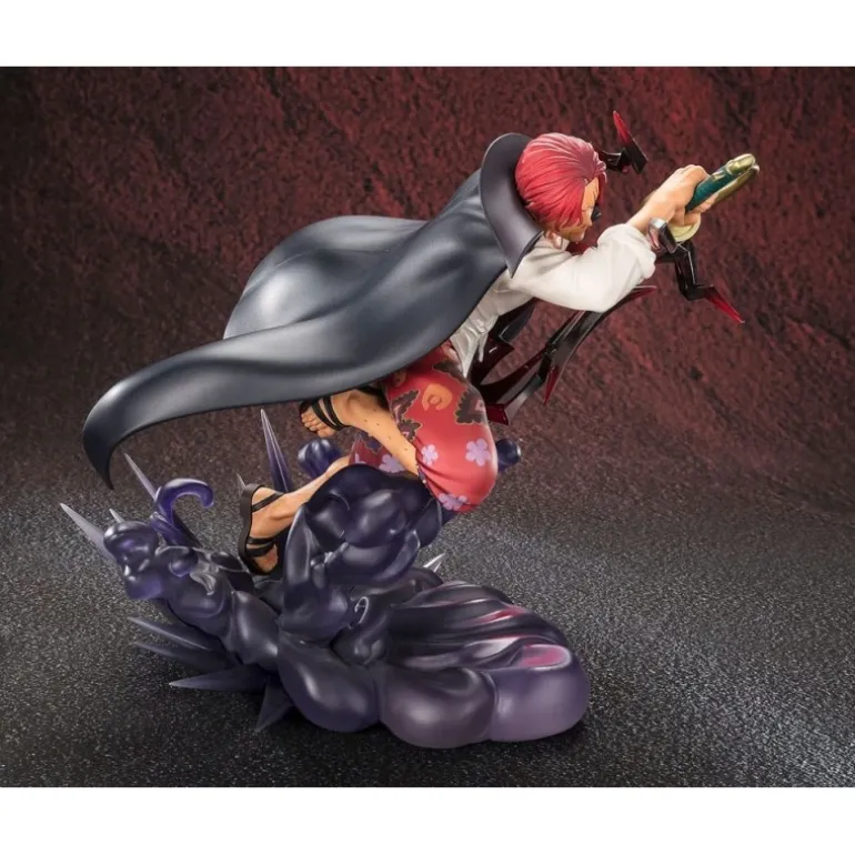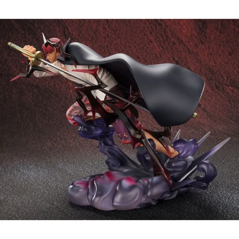 La estatua muestra a Shanks en una postura poderosa, empuñando su espada con determinación. Destacan sus pantalones florales de colores vivos y su capa negra ondeando al viento, elementos que aportan dinamismo y un toque de dramatismo a la escena. El efecto de energía oscura a sus pies, en tonos morados, añade una dimensión épica a esta representación. Sus rasgos faciales están cuidadosamente diseñados para reflejar su carácter intrépido y su cabello rojo vibrante completa el conjunto de manera perfecta.