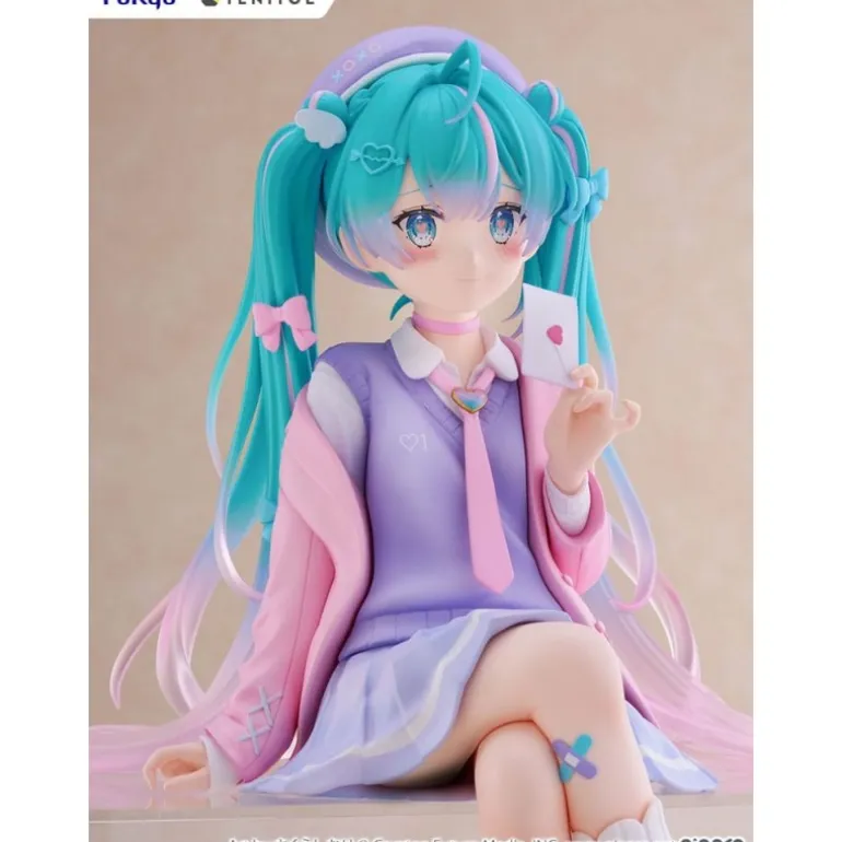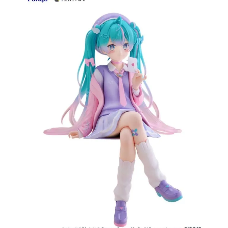 Descubre la encantadora estatua de PVC de Hatsune Miku, una pieza de colección que los fans del manga y anime adorarán. Con una altura de aproximadamente 32 cm, esta estatua captura a Hatsune Miku con un detalle impresionante. Vestida con un atuendo adorable que combina diferentes tonos de pastel, la figura presenta una mezcla de rosa y lavanda que resalta su peinado de coletas largas azul turquesa, adornado con pequeños lazos y accesorios.