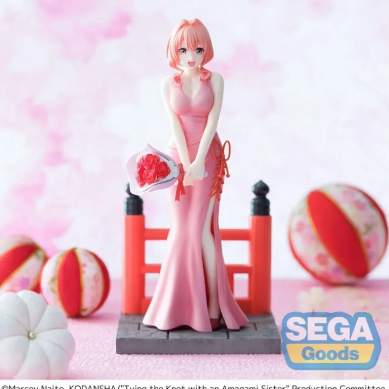 Descubre la encantadora estatua de Yuna Amagami, inspirada en el manga Tying the Knot with an Amagami Sister. Esta figura captura la esencia del personaje con detalles meticulosos, desde su cabello rosado y ondulado hasta el elegante vestido de gala color rosa que lleva puesto. Yuna sostiene un ramo de flores rojas en sus manos, complementando perfectamente la base decorativa de estilo japonés que la acompaña.