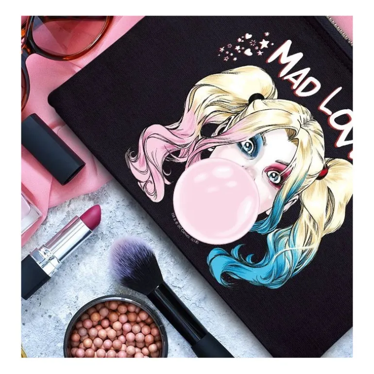 Un genial neceser o estuche portatodo, ideal para usar como bolsa de maquillaje, con un precioso diseño inspirado en una de las villanas más emblemáticas y divertidas del mundillo de los superhroes y DC Comics en particular, la gran Harley Quinn.