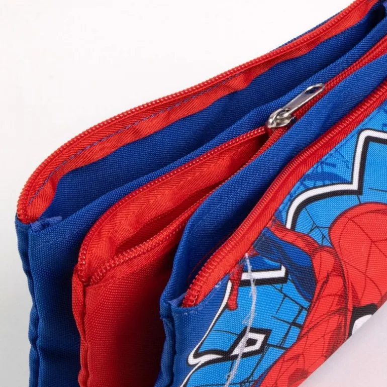 Este estuche portatodo de Spiderman es el complemento perfecto para los pequeños héroes. Con un vibrante diseño en azul y rojo, este estuche destaca por la imagen del icónico Spiderman listo para la acción sobre un fondo azul con detalles en telaraña. Fabricado en 100% poliéster, es resistente y duradero, ideal para el uso diario de los niños en el colegio o en casa.
