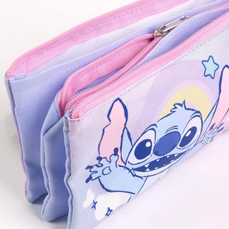 Este **estuche portatodo** inspirado en **Stitch** es el complemento ideal para los pequeños fans de este adorable personaje. Fabricado en **100% poliéster**, ofrece un diseño en tonos lilas y rosas que se complementa con una divertida imagen de Stitch junto a elementos espaciales como planetas y estrellas, en la parte delantera. La parte trasera cuenta con una etiqueta que dice «Not Your Bag!» y un espacio para escribir el nombre, personalizándolo a gusto del dueño.