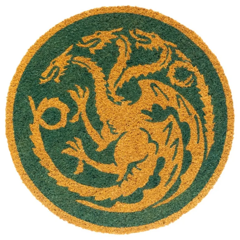 Descubre la elegancia de este felpudo **Juego De Tronos** inspirado en «La Casa del Dragón«. Diseñado en forma circular, presenta un impactante color verde oscuro como base con un llamativo dragón en tono dorado que resalta en su superficie. Este diseño, fácil de reconocer, es perfecto para **fanáticos de la serie** que deseen añadir un toque temático a su hogar.