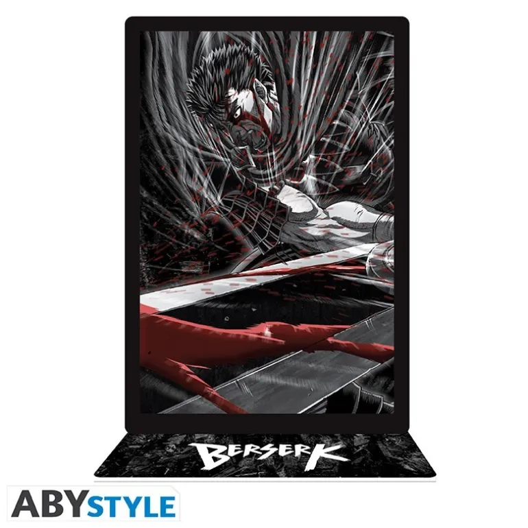 Sumérgete en el mundo de Berserk con esta impresionante figura acrílica de Guts. Producida por ABYstyle, esta pieza muestra a Guts blandiendo su enorme espada, listo para enfrentarse a cualquier monstruo. El producto viene con tres piezas para ensamblar: personaje, emblema/logo y base.