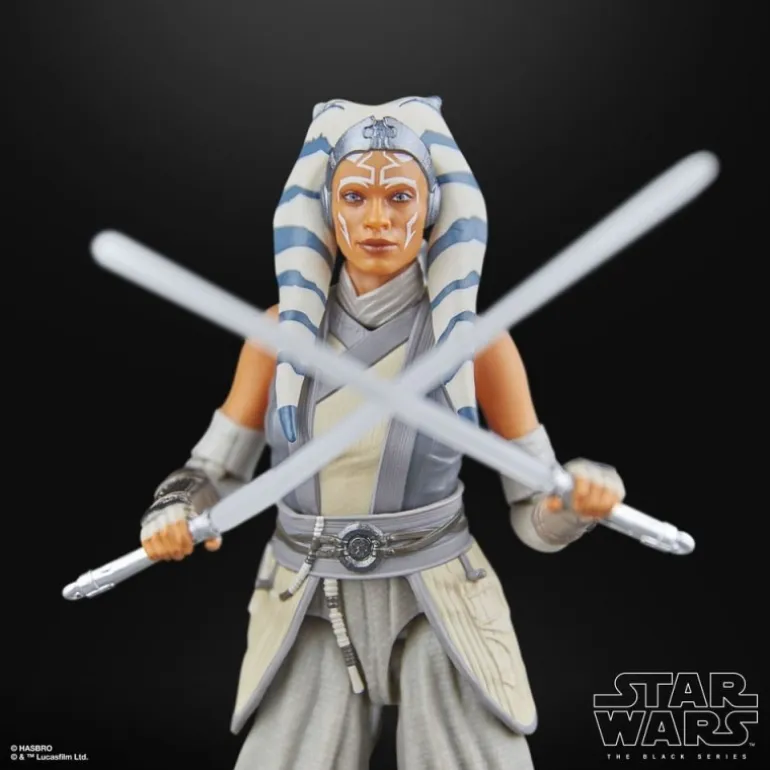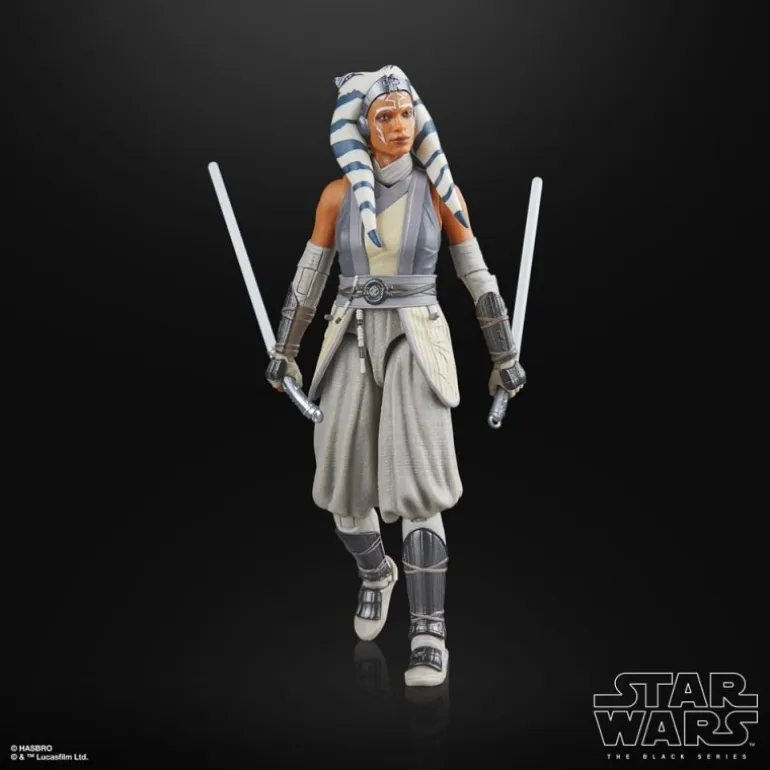 Ahsoka Tano luce su característico atuendo, con patrones y colores fieles a su aparición en la serie. El esculpido capta perfectamente su expresión decidida, mientras que sus sables de luz gemelos, en un elegante tono plateado, ofrecen un toque de realismo y calidad.