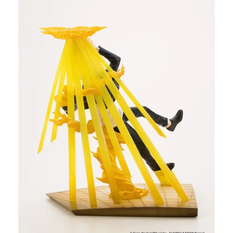 La estatua representa a Satoru Gojo en una postura vibrante rodeado de efectos de aura amarilla que emanan de una base geométrica que simula un suelo de azulejos. Su vestimenta combina un elegante traje negro con camisa blanca, destacando su estilo distintivo. Los detalles finamente esculpidos y los colores vivos hacen que esta estatua cobre vida en cualquier colección.