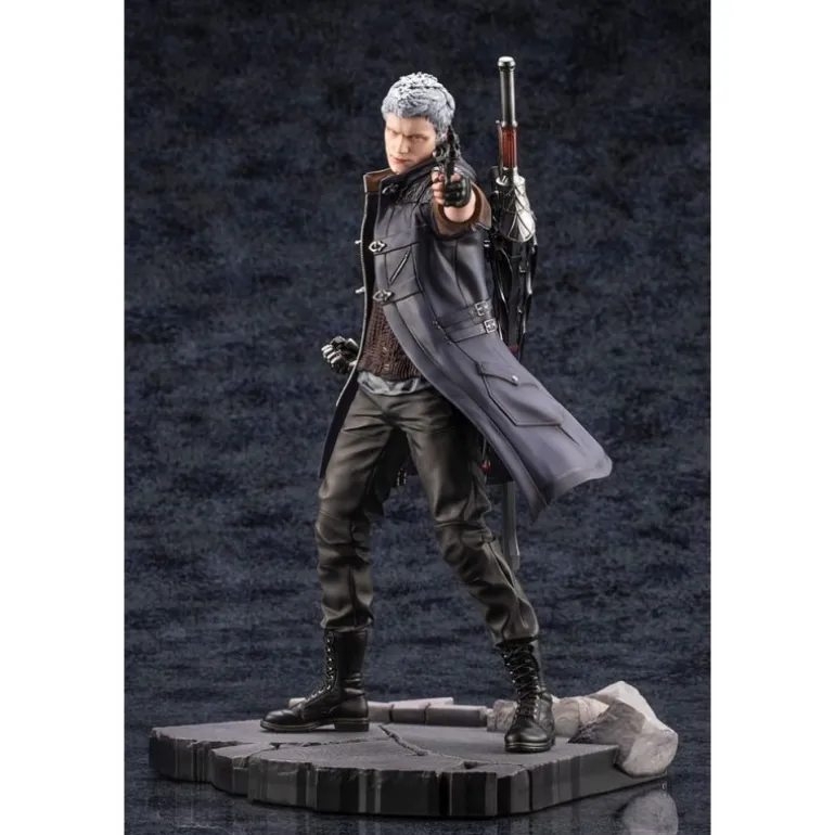Esta pieza de colección destaca por su acabado meticuloso, mostrando a Nero en una postura dinámica, preparado con su pistola y su característico abrigo largo de color oscuro.