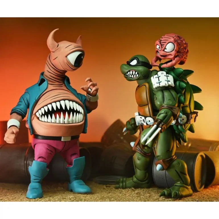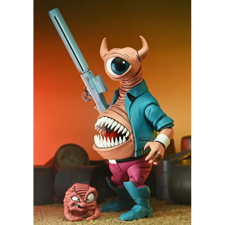 El acabado de la figura muestra a Bellybomb con un ojo y una boca prominente, vistiendo una chaqueta azul y pantalones rosados, que capturan su esencia original del cómic. Incluye varios accesorios como manos intercambiables, una cabeza extra y un arma, todo empaquetado en una caja con ventana, ideal para exhibición o regalo. Una pieza indispensable para los coleccionistas y entusiastas de las Teenage Mutant Ninja Turtles.