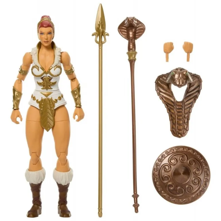 Explora el mundo de Masters of the Universe con esta impresionante figura articulada de Teela de la colección New Eternia. Con un tamaño de 18 cm, esta figura presenta un diseño detallado con armadura blanca y dorada, botas marrones con detalles en piel y una tiara acorde a su estatus de guerrera. Los accesorios incluyen una lanza y un escudo, permitiendo recrear escenas icónicas o crear nuevas aventuras. Fabricada por Mattel, este producto oficial es un imprescindible para cualquier fanático de la serie.