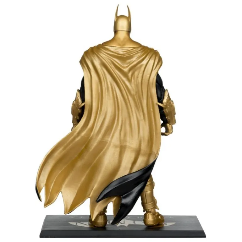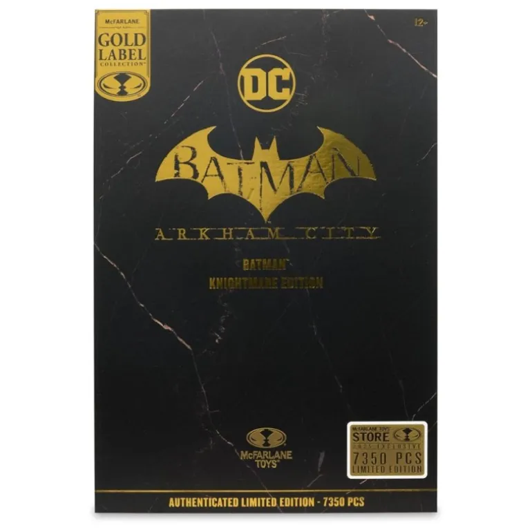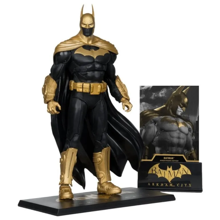 Descubre la impresionante figura de Batman Knightmare Edition de la colección Gold Label, fabricada por McFarlane Toys. Esta figura articulada de 19 cm pertenece a la línea DC Multiverse, inspirada en el aclamado juego Arkham City. Su diseño destaca por un llamativo esquema de colores en negro y dorado, perfeccionado con detalles en oro que realzan su elegante capa y armadura.
