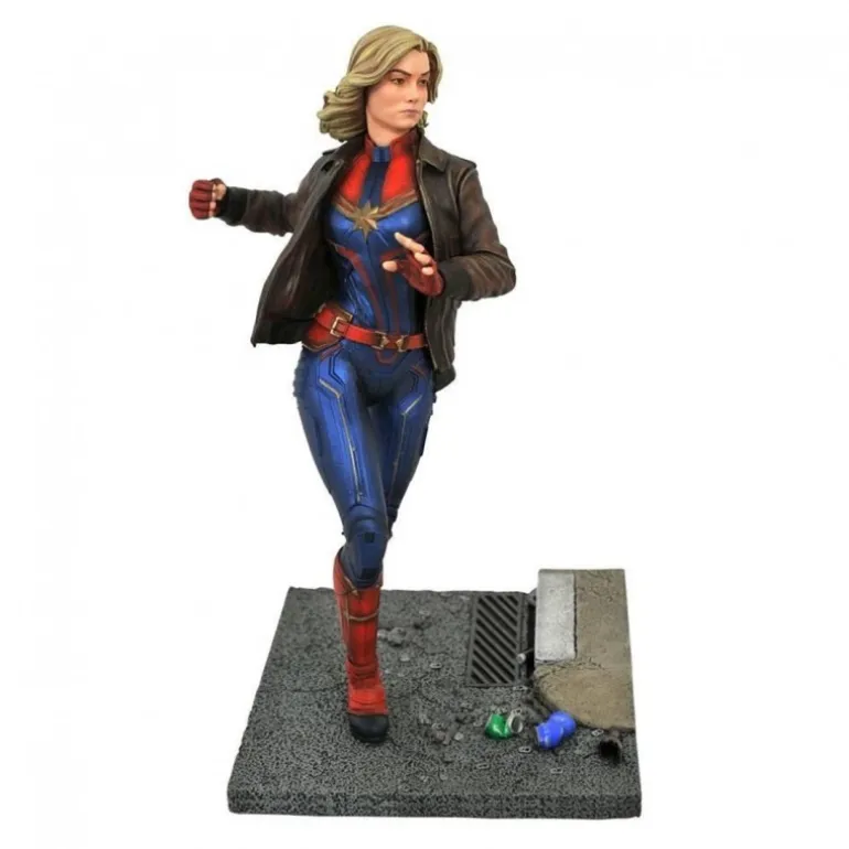 Explora el universo Marvel con esta exclusiva figura de resina de la Capitana Marvel de Diamond Select Toys. Esta estatua, de 28 cm de altura, presenta a la heroína en una dinámica postura de carrera, luciendo un traje detallado que combina con su icónica chaqueta de cuero marrón. La base recrea un escenario urbano con elementos de color que añaden realismo.