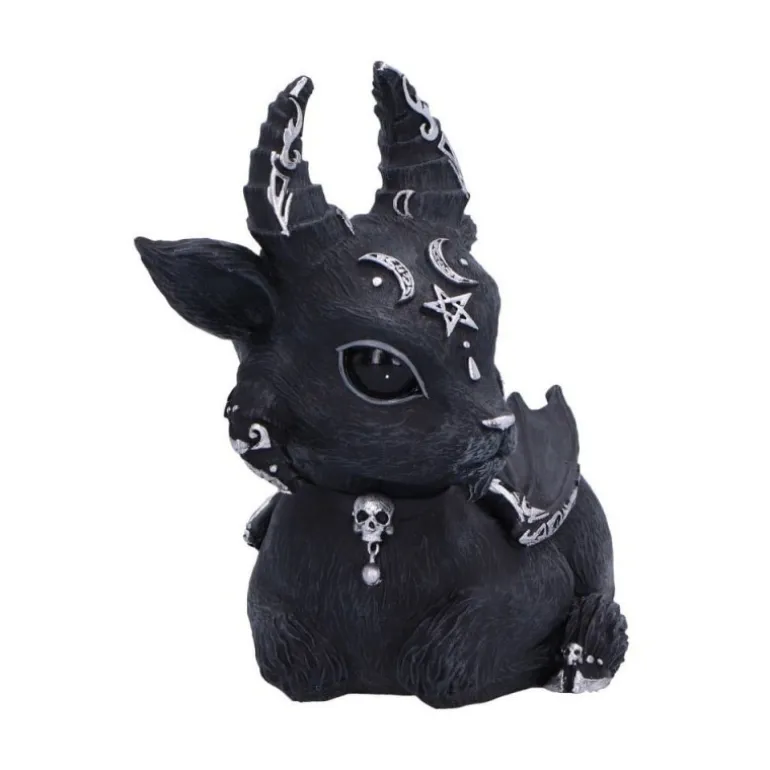 Las características distintivas de la figura incluyen dos cuernos decorados con intrincados diseños en plata que contrastan con su oscuro pelaje, así como una pequeña capa con detalles plateados que añade un aire de misterio. Su expresión intrigante y sus ojos grandes aportan un encanto especial, que sin duda capturará la atención de cualquier observador.