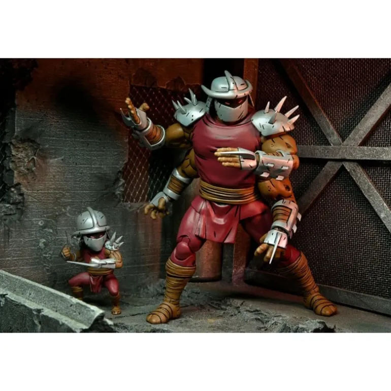 El Shredder Clone presenta un diseño robusto con características musculosas y una armadura plateada con picos que decoran sus hombros, brazos y casco, contrastando perfectamente con su vestimenta roja y detalles en color ocre. El Mini Shredder complementa la figura principal, replicando con fidelidad el estilo del villano icónico a menor escala.