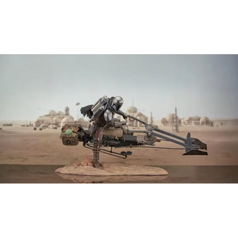 La impresionante estatua de Din Djarin de Star Wars: The Mandalorian es una obra maestra creada por Diamond Select Toys. Con una altura de 23 cm y esculpida a una escala de 1/7, esta figura detalla al Mandaloriano en una pose dinámica sobre su moto speeder.