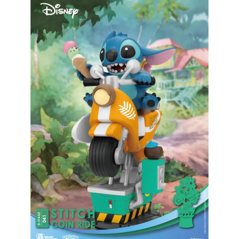 Se trata de un diorama que incluye una detallada figura del adorable Stitch, montado en una motillo de esas a las que se les echa monedas y se mueven. Se trata de un diorama fabricado en PVC, con una cantidad de detalles excepcional y fidelidad absoluta a los personajes originales, pintados a mano cuidadosamente. Mide aproximadamente 16 cm de alto y tiene el logotipo de Lilo y Stitch en la base perfectamente reproducido.