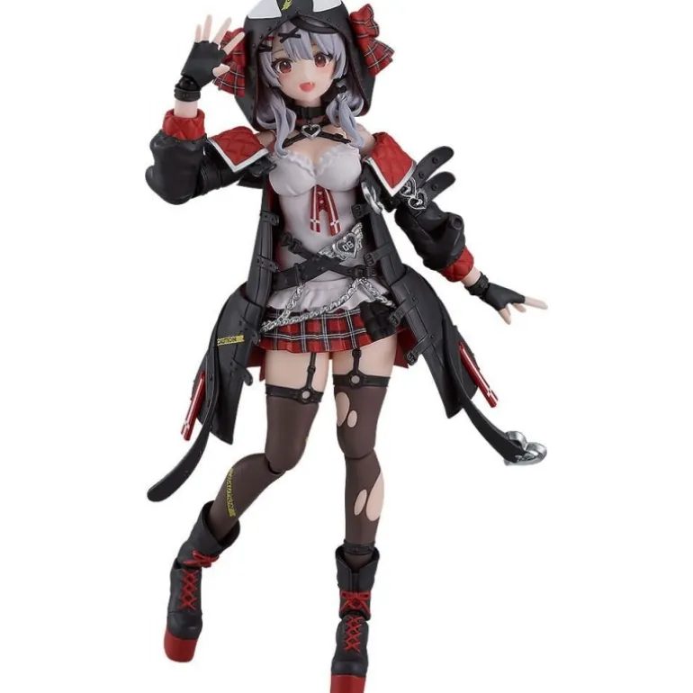 El diseño presenta una combinación de colores negro, rojo y blanco, con detalles que resaltan su atuendo característico, como la falda a cuadros y el abrigo con capucha. Sus botas de plataforma y guantes completan un look moderno y audaz. Cada pieza está cuidadosamente esculpida para ofrecer un acabado impecable.