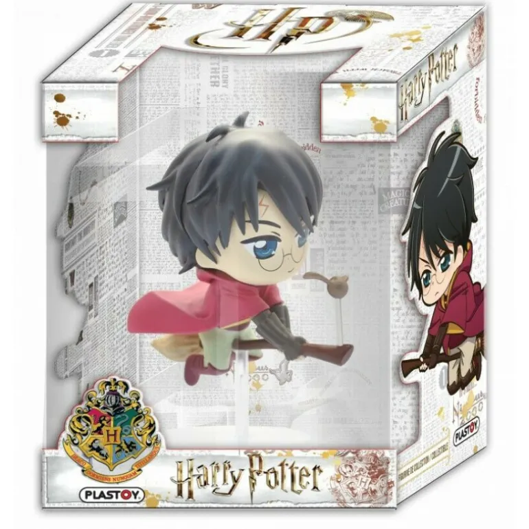 Se trata de una figura fabricada y diseñada por Plastoy, coloreada primorosamente, con un montón de detallitos que hacen que reconozcas a Harry Potter al instante, en una versión muy cuqui, con el típico estilo del manga y el anime. Además aparece montado en su escoba Nimbus 2000, con la túnica roja de Gryffindor, en pleno partido de Quidditich, persiguiendo una snitch dorada. Además, incluye una peana para que mantenga siempre erguida.