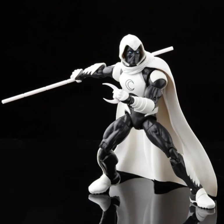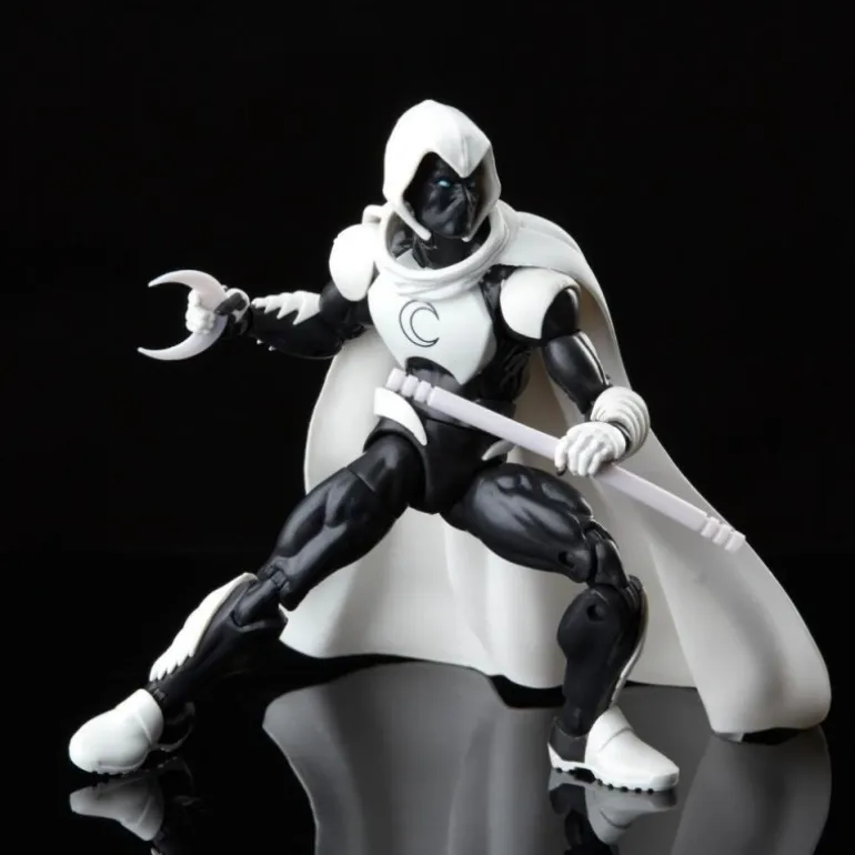 La figura representa a Moon Knight, también conocido como Caballero Luna, con su icónica vestimenta blanca y negra, capturando la esencia del mercenario Marc Spector que resucitó para convertirse en el avatar del dios de la Luna, Khonshu. Incluye accesorios intercambiables como un bastón y manos adicionales para poses dinámicas.