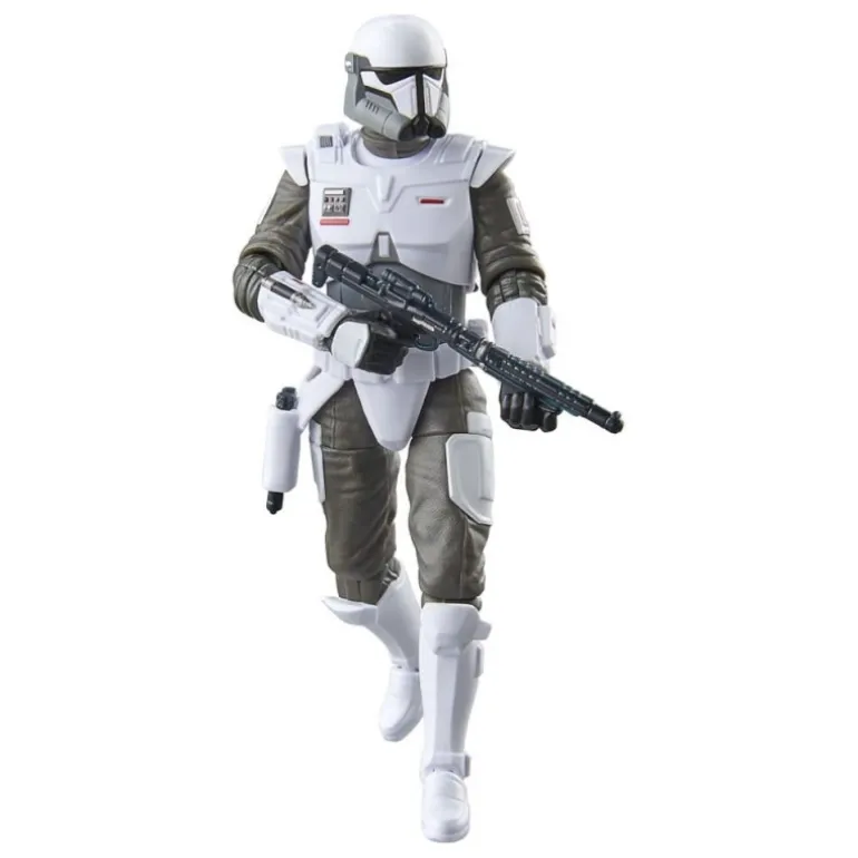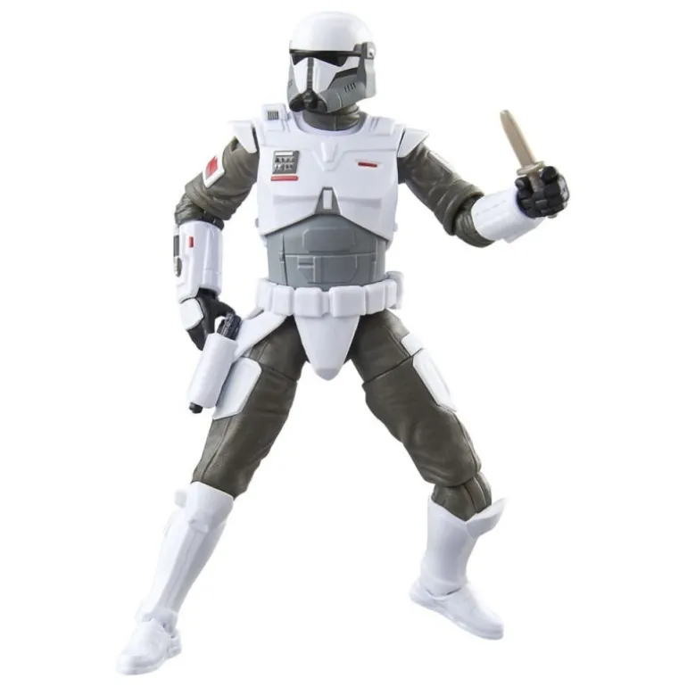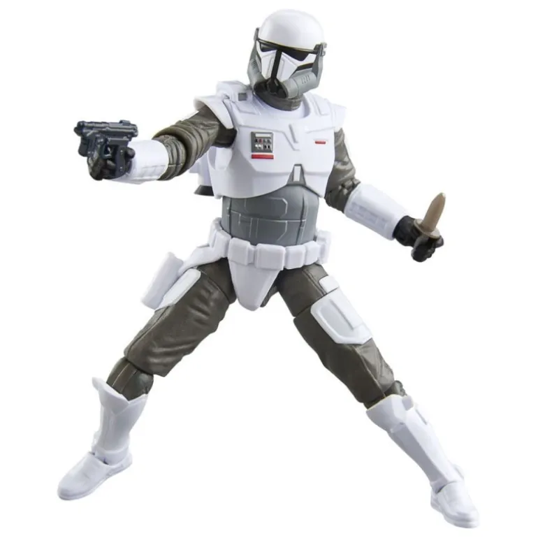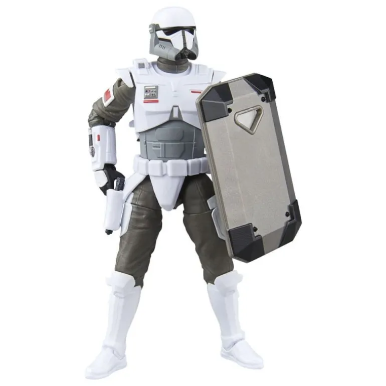 Con su armadura blanca y gris, esta figura recrea fielmente el aspecto de los famosos comandos imperiales blindados. El personaje está equipado con un escudo y un bláster, características que resaltan su rol de protector en la galáctica saga de Star Wars.